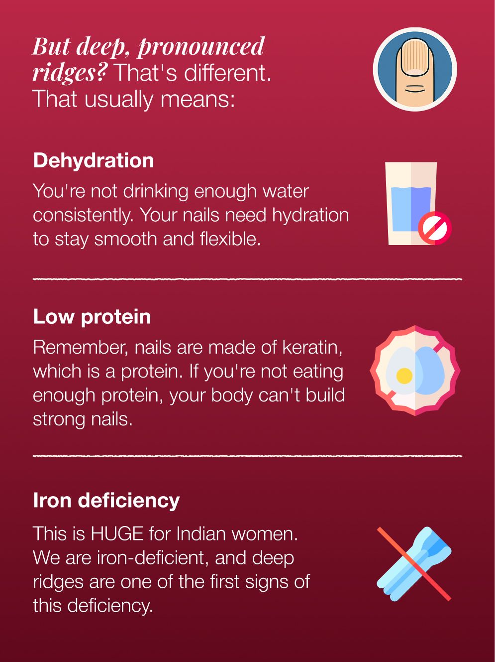 If your ridges have suddenly gotten worse, check your iron levels. Ferritin should be above 50 ng/mL for healthy hair and nails, not just the bare minimum of 15.
