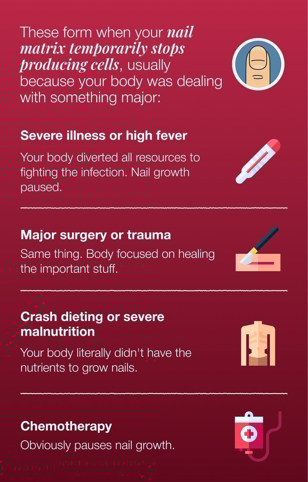 Your body prioritizes vital organs over nails. So when resources are low, your nails suffer first. They're basically your body's early warning system.